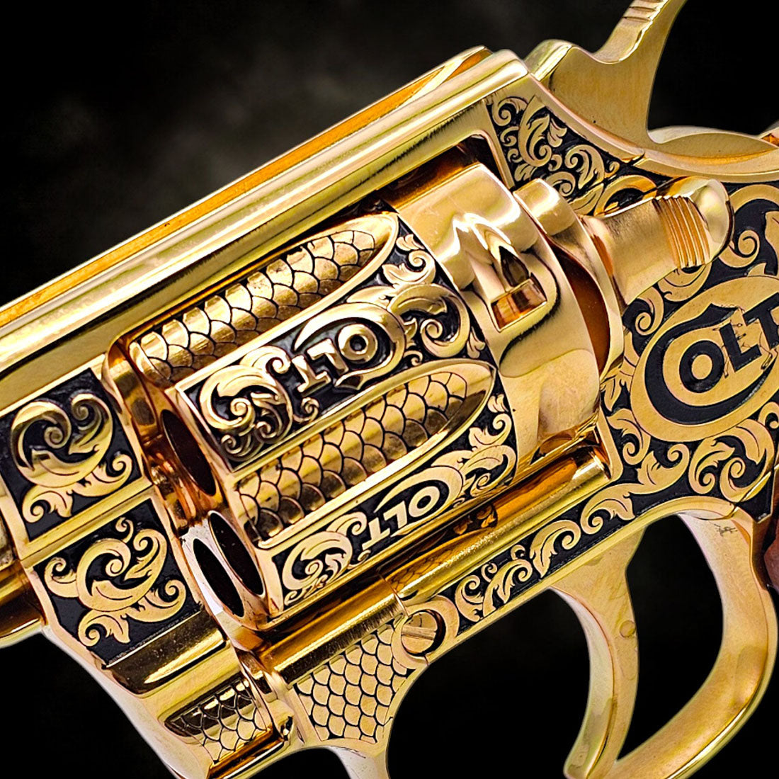 24K Gold Plating: The cylinder, hammer, trigger, and other select accents are lavishly plated in genuine 24K gold, offering a striking contrast to the engraved stainless finish and adding unparalleled luxury.