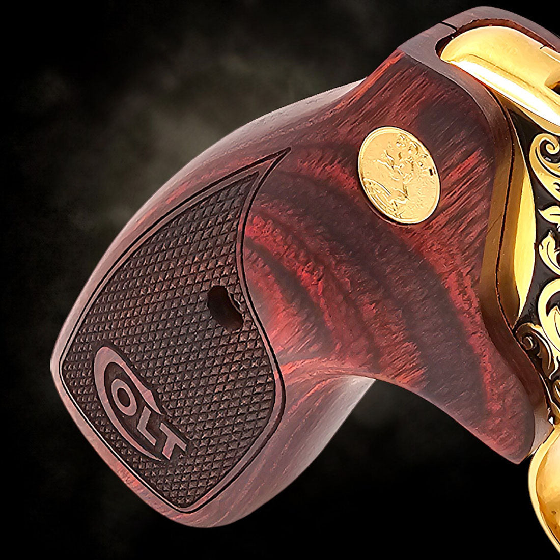 Luxurious Rosewood Grips: Upgraded with custom Luxuries Colt Rosewood Checkered Grips, offering a sophisticated contrast to the gold finish and ensuring a comfortable hold.