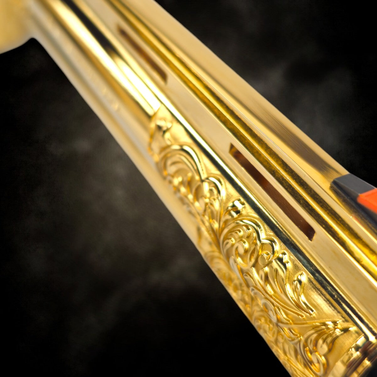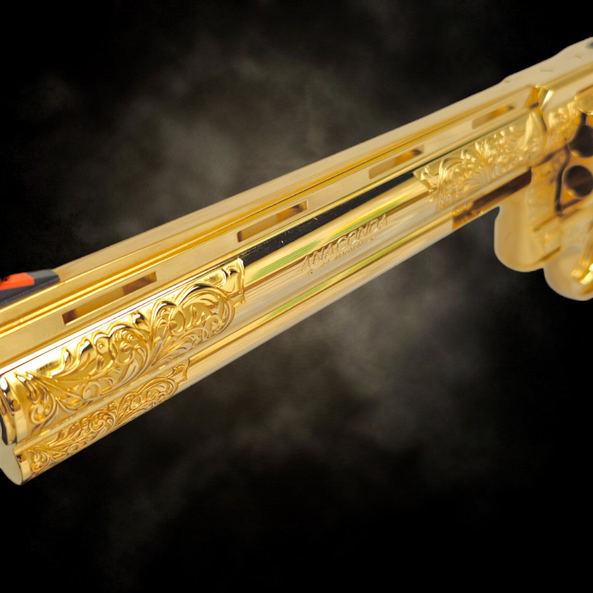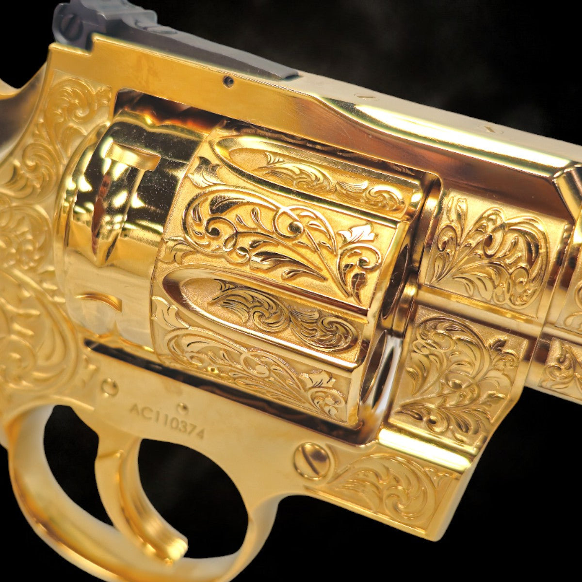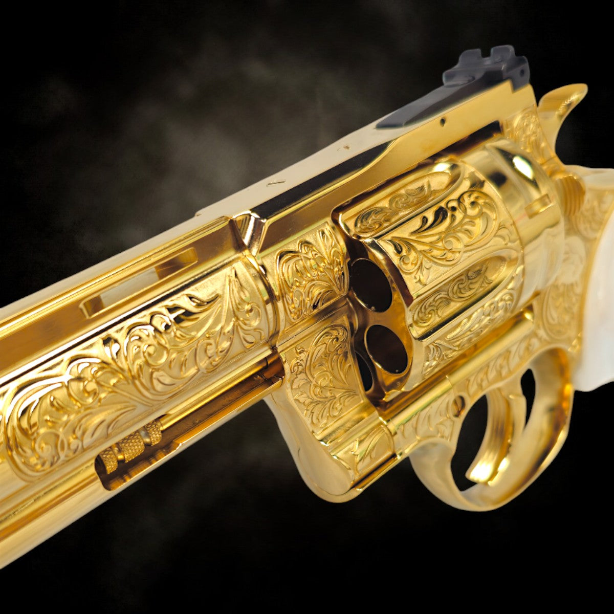 What makes this luxury handgun truly exceptional is its magnificent 24K Gold Plating on the cylinder, hammer, and trigger, complemented by a brilliant polished chrome or stainless steel frame. The entire revolver features intricate custom engraving, adding a layer of artistry that elevates it beyond a mere firearm into a treasured work of art.